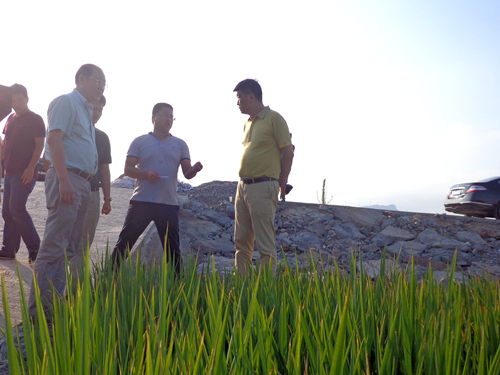 从艺术馆出来,张勇军一行冒着酷暑来到浮田生物科技有限公司样板田的田头,实地察看滩涂水稻种植及土壤改良情况。