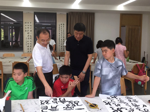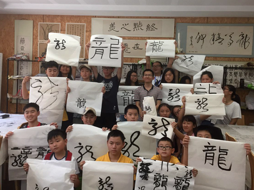 李承戍一行来到该校科艺楼,在书法教室,向刚下课的营员们询问他们的学习、生活情况。在看到孩子们刚学写的书法字体“龙”时,他夸赞大家学写汉字进步快,并鼓励营员们要好好学习,掌握汉字的特点,真正理解”中国龙“的含义,要熟知和传播好中国文化,将来当中外文化交流的使者。